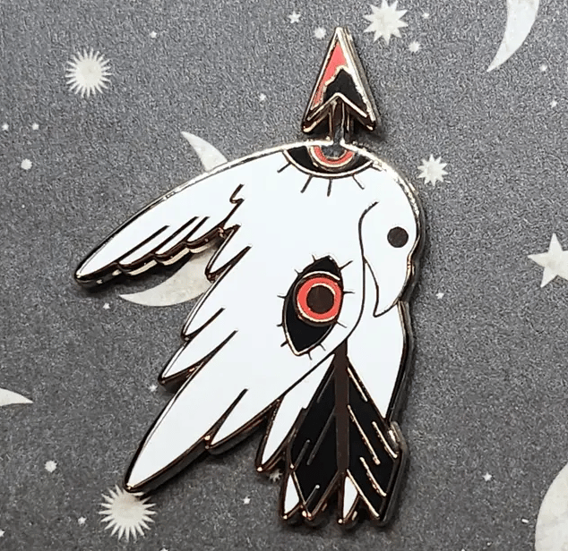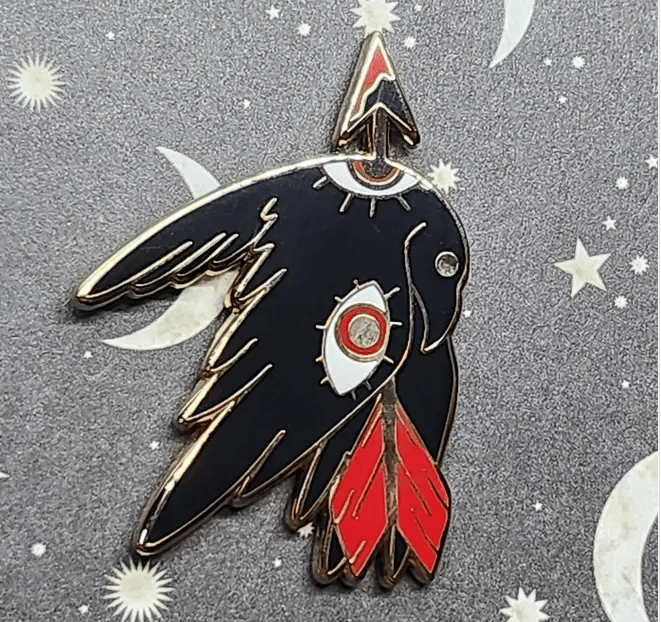 Enamel Pin of original art raven with extra eyes being shot with an arrow.