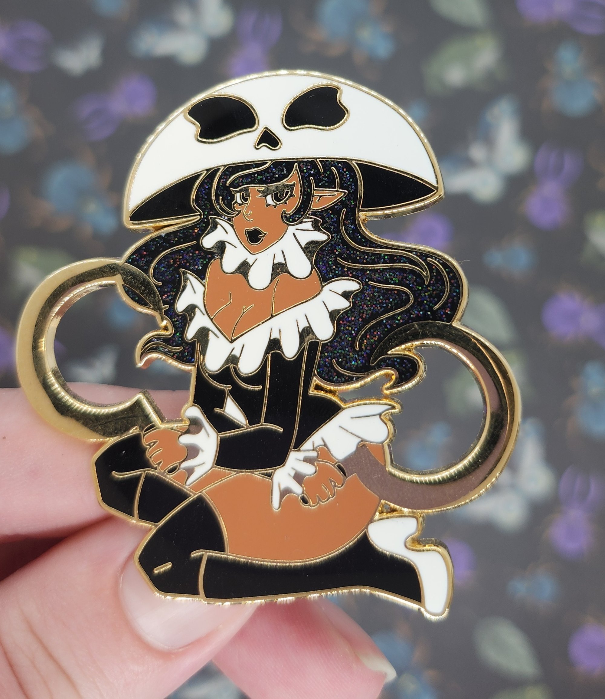glitter hair, gold metal, 2 pin posts, cat head pins back stamp