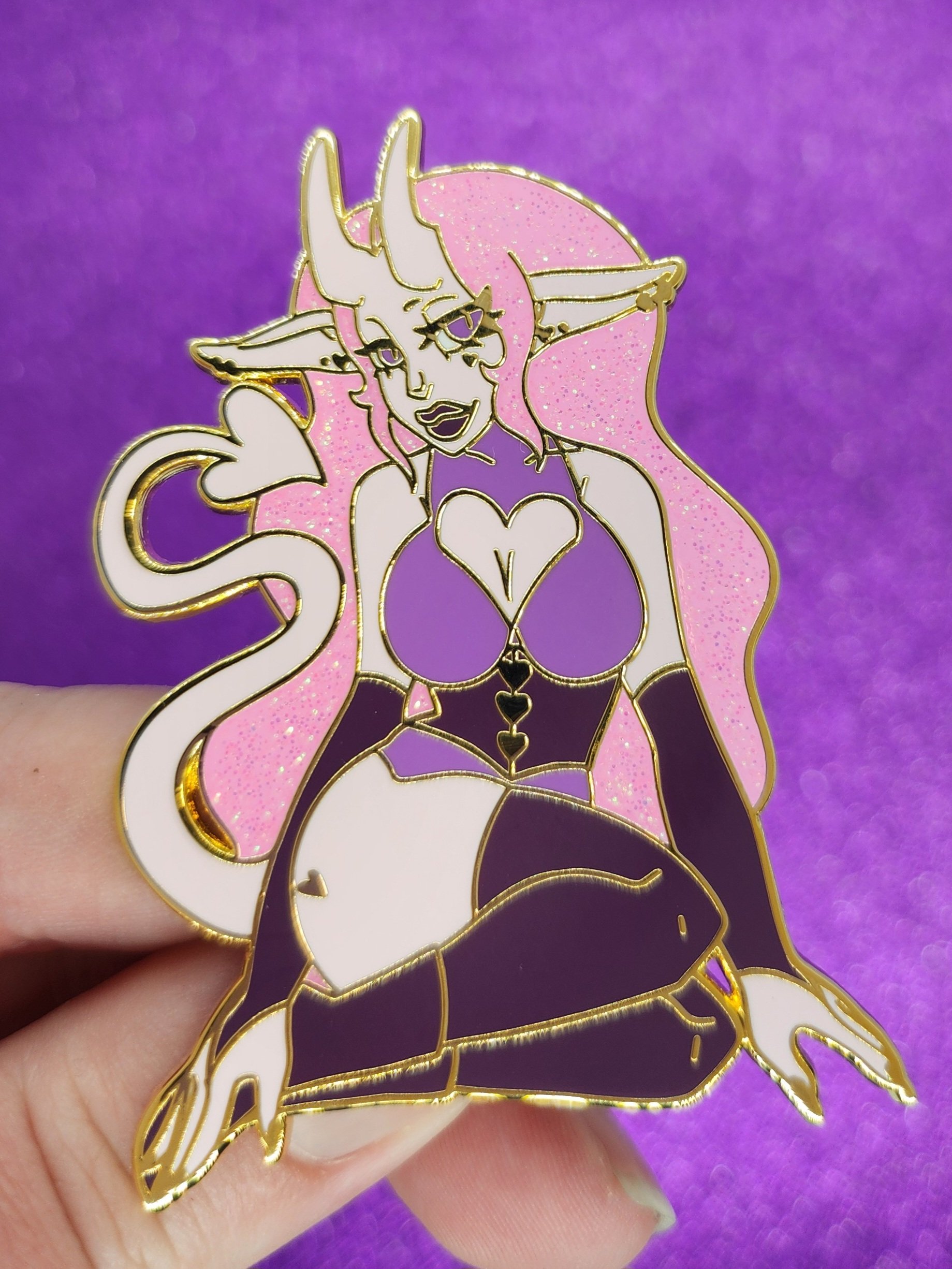 Roughly 2.6 inches tall, 2 pin posts, glitter hair, gold metal, enamel pin, cat head pins back stamp
